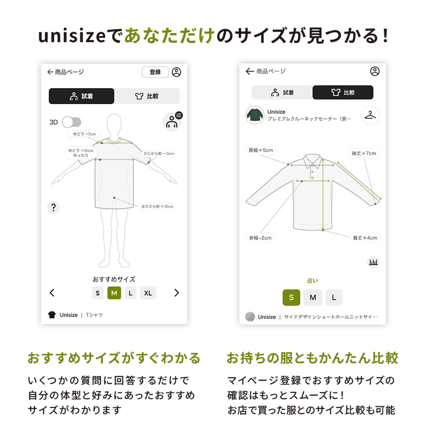 unisizeは、いくつかの質問に答えるだけで、お客様の体型やお好みに合ったおすすめサイズがわかる便利な機能です。