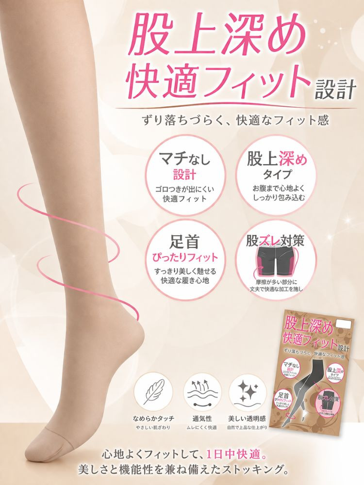 無地ストッキングで股上深めで快適なフィット感を追求しました。