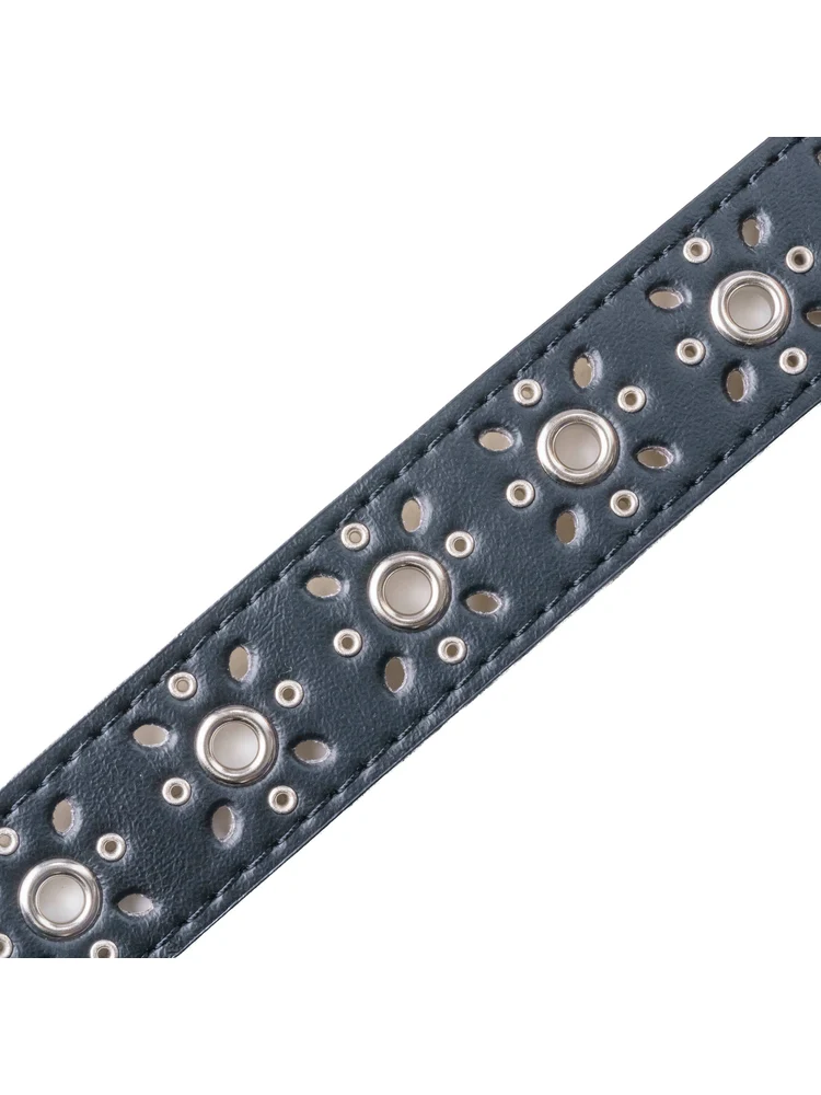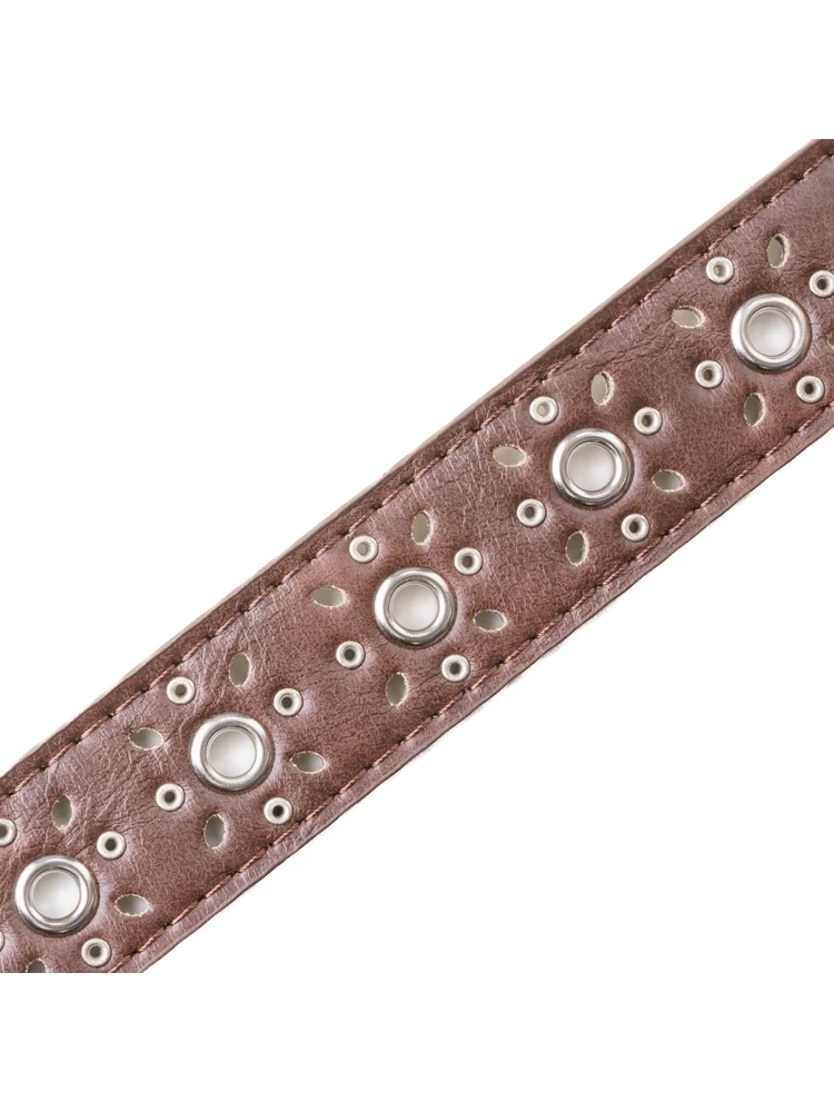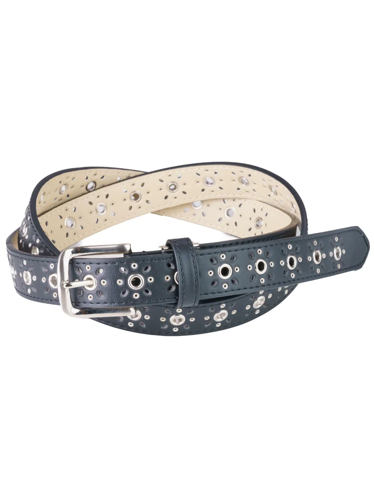シルバーのハトメがクセントのベルト。全体にハトメを使うことでデザインだけでなくサイズ調整がしやすい。