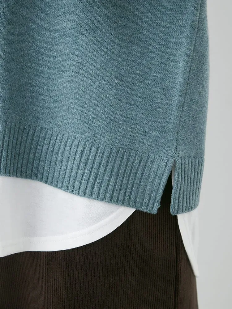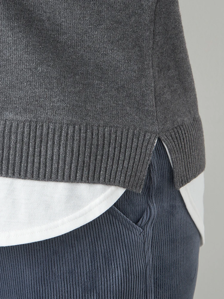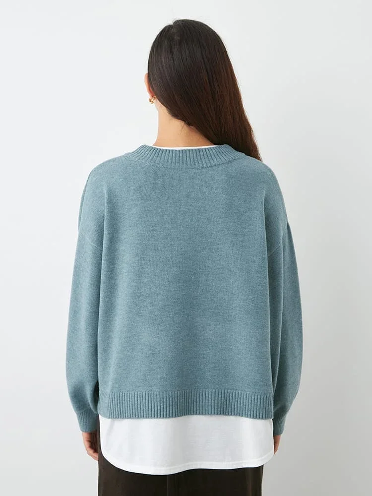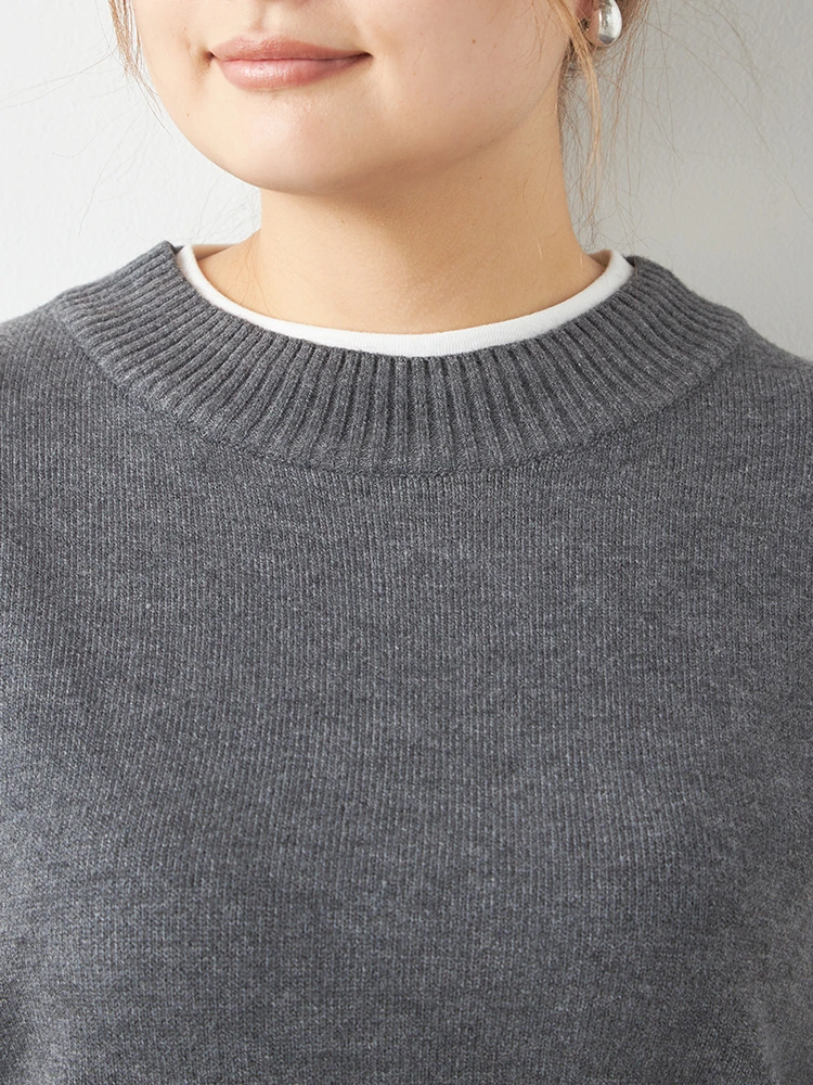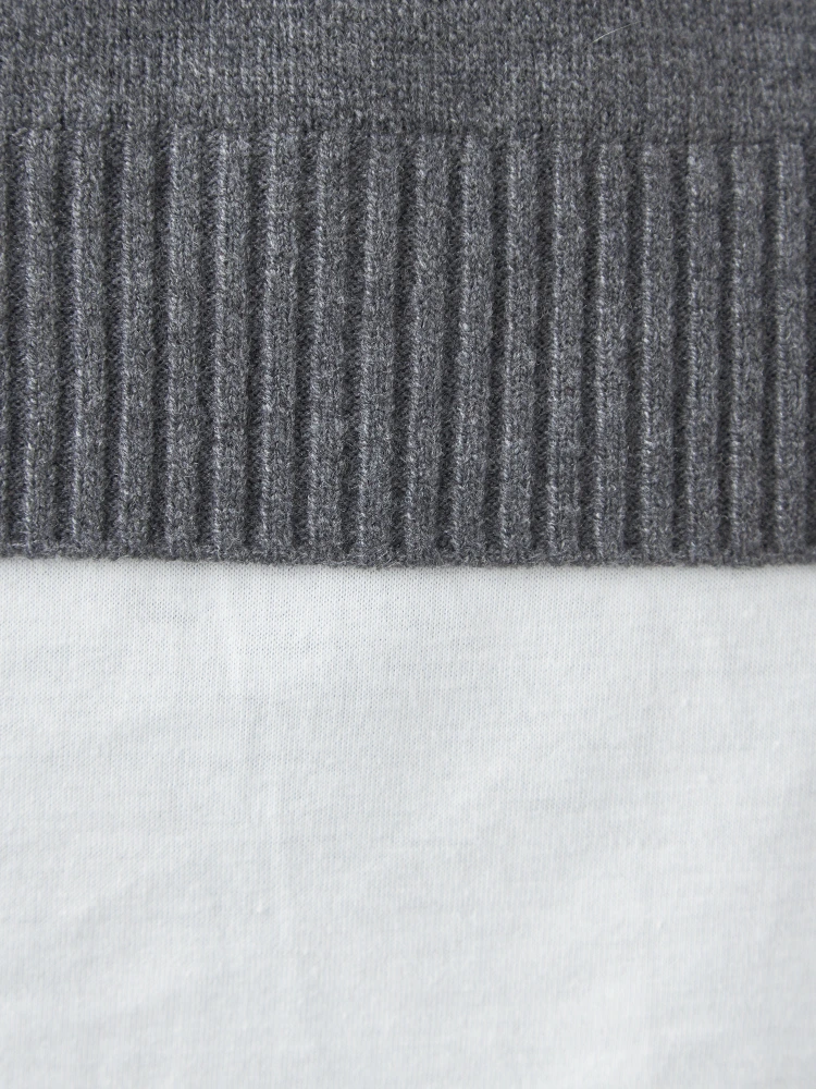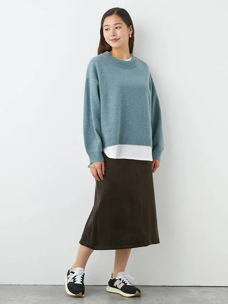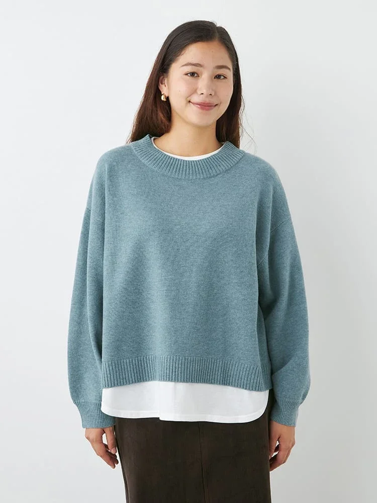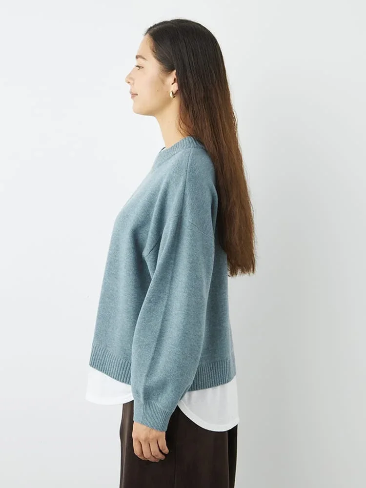 首もとと裾からカットソー生地が覗く、フェイクレイヤード仕立てのニットプルオーバー。