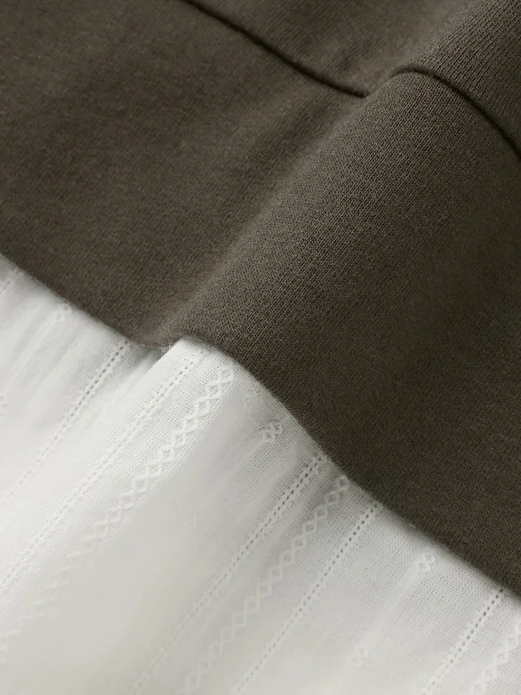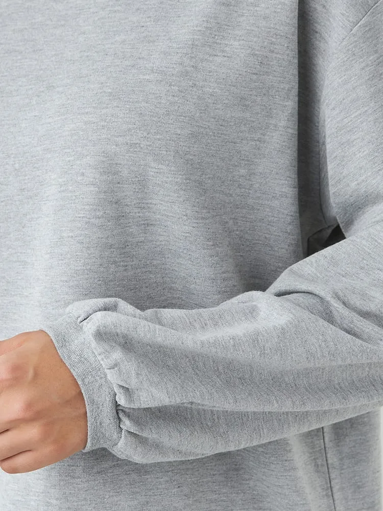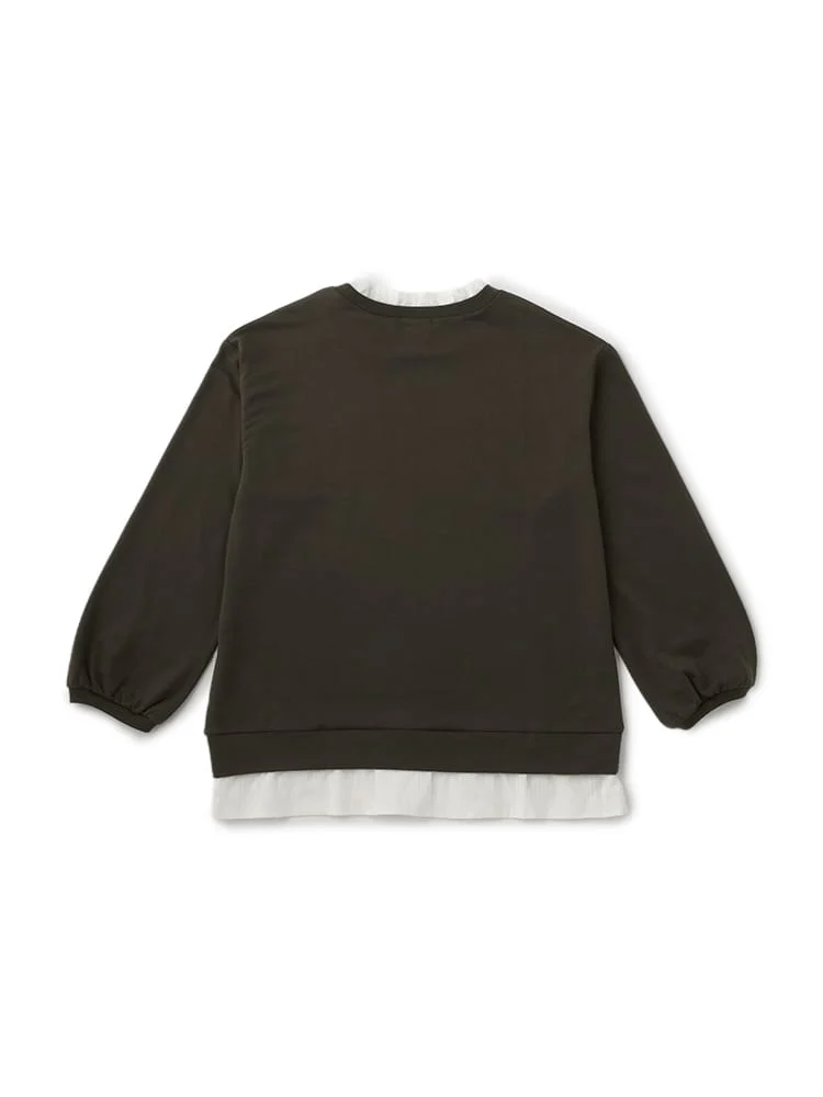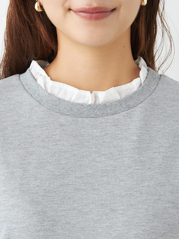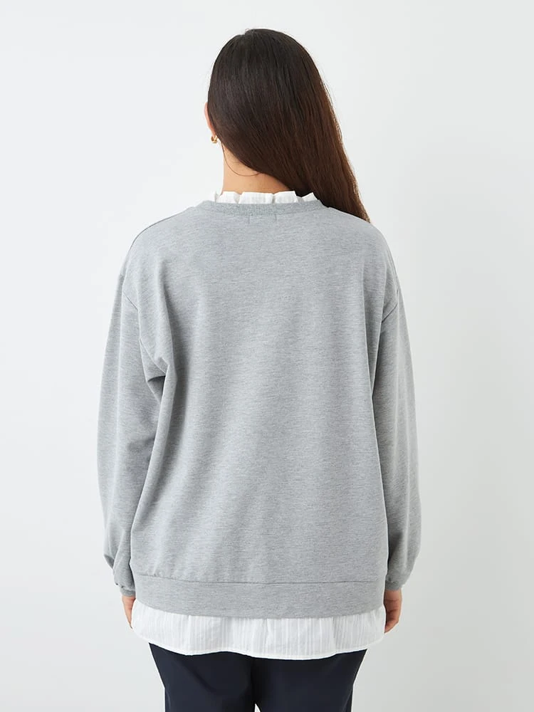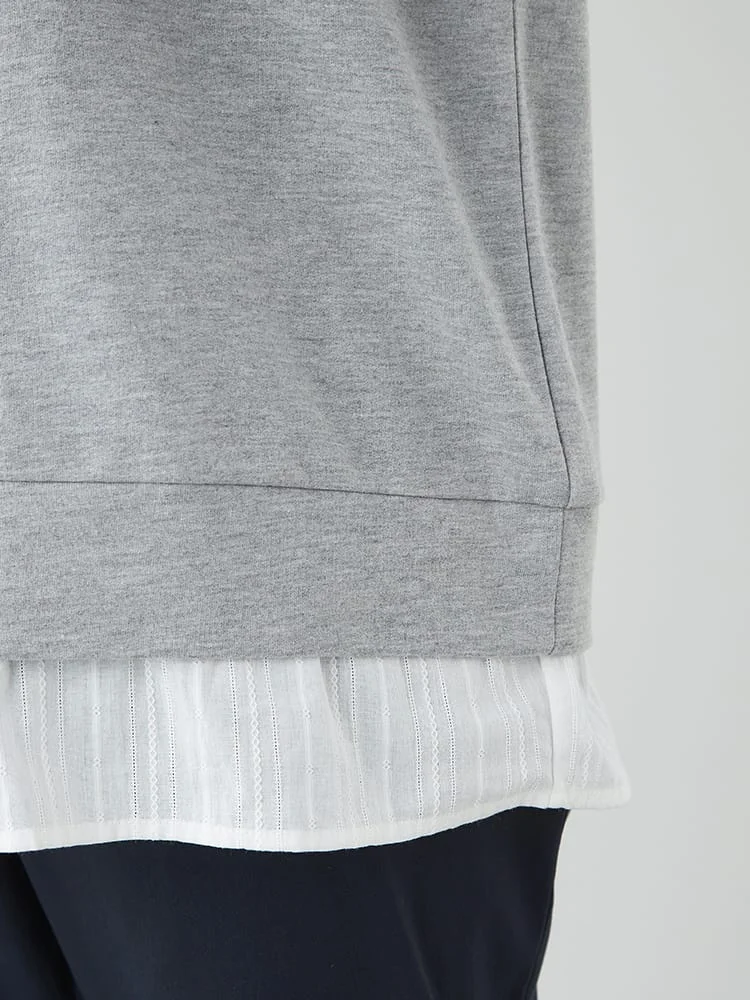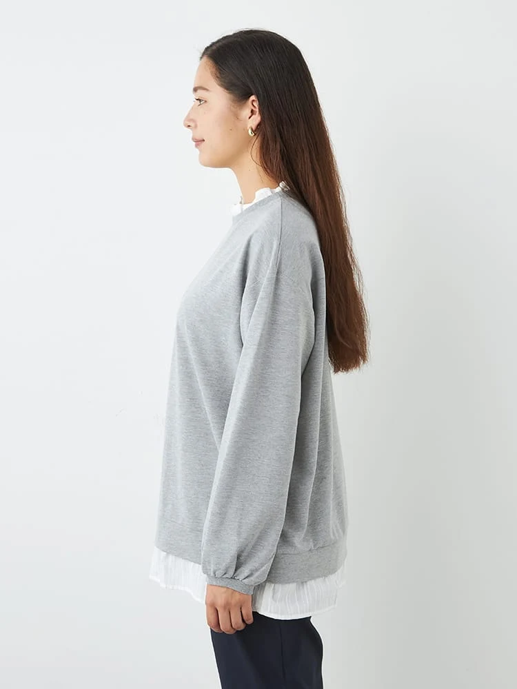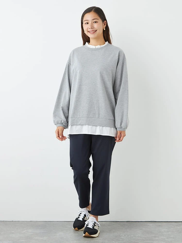 ブラウスに、スウェットを重ね着しているようなルックスが1枚で完成。