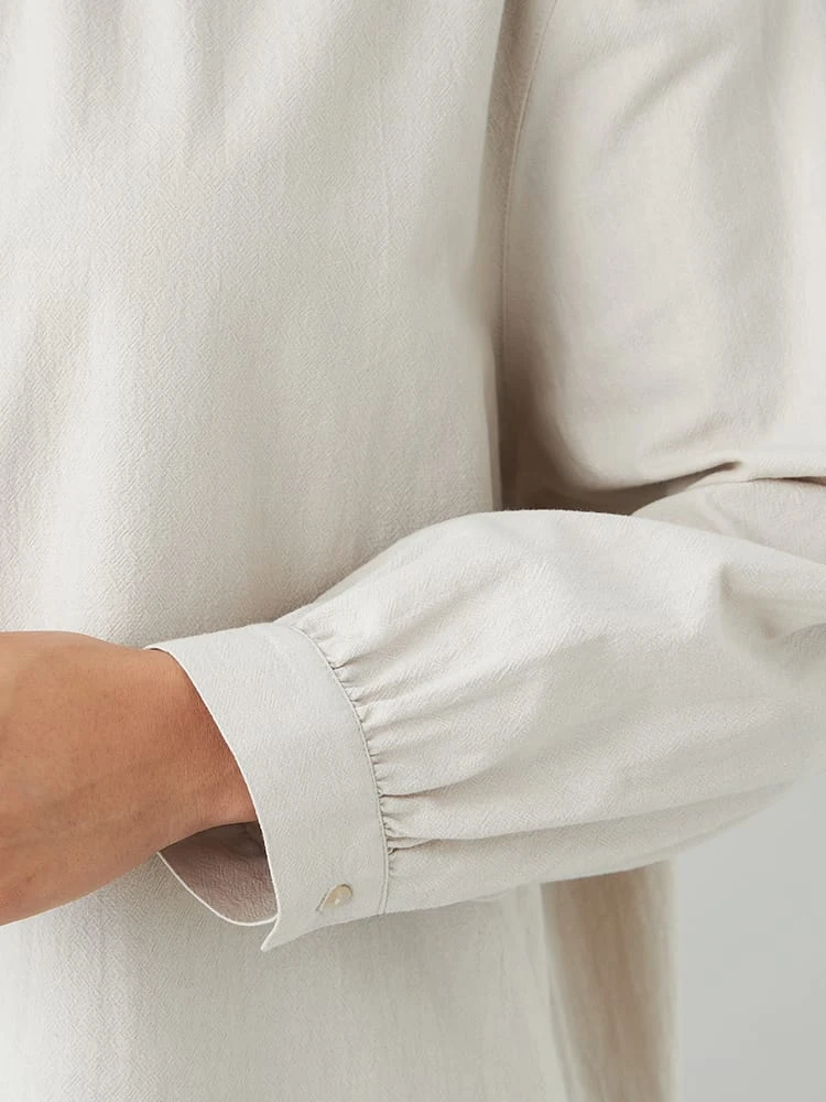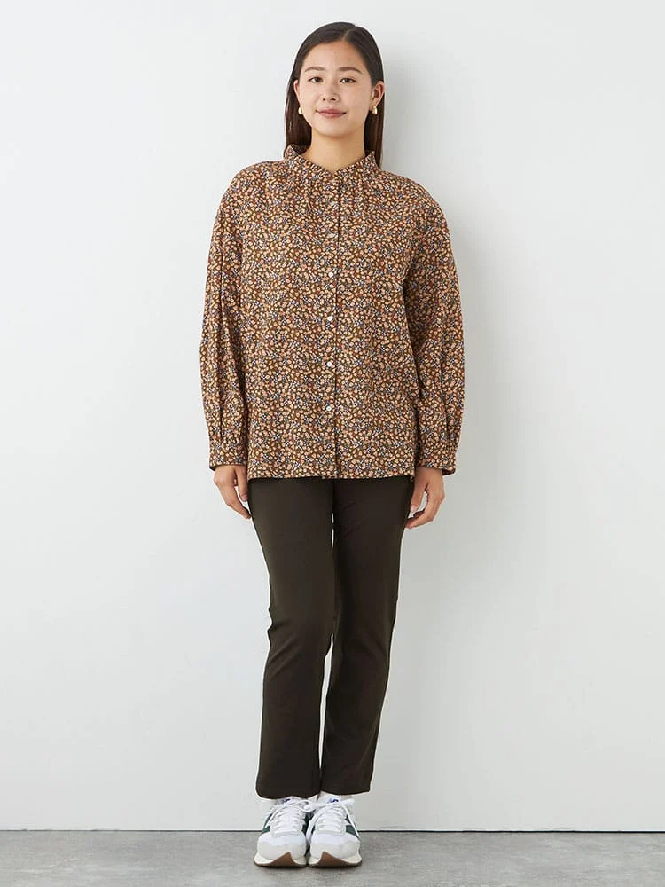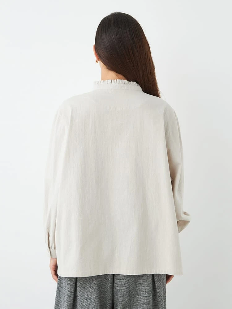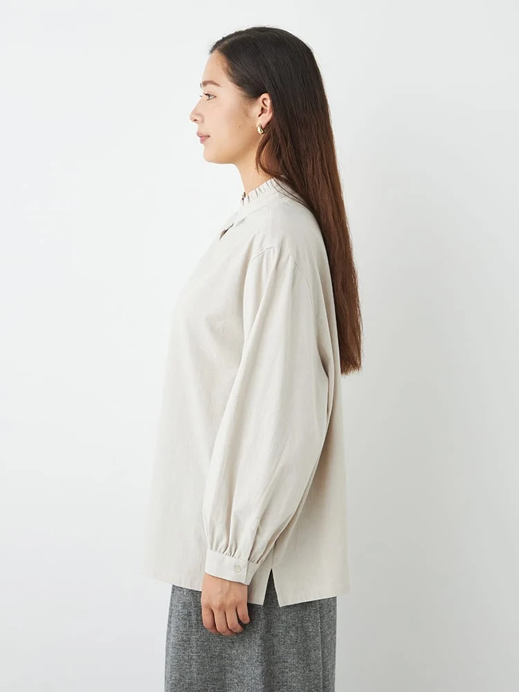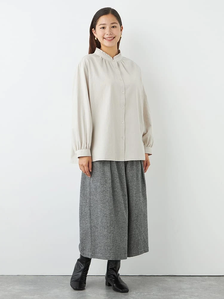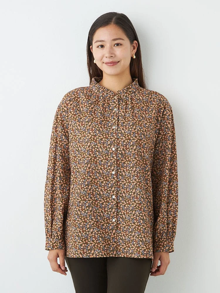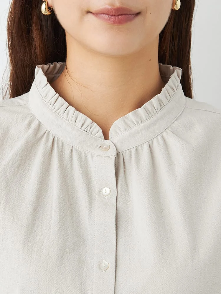 細かなフリルをあしらった襟がさりげなく甘さをプラスしてくれる長袖シャツ。