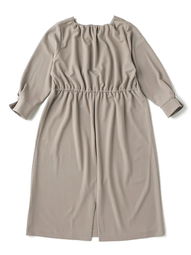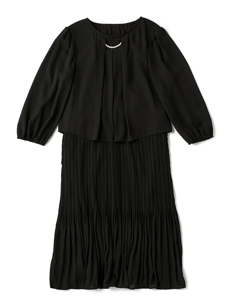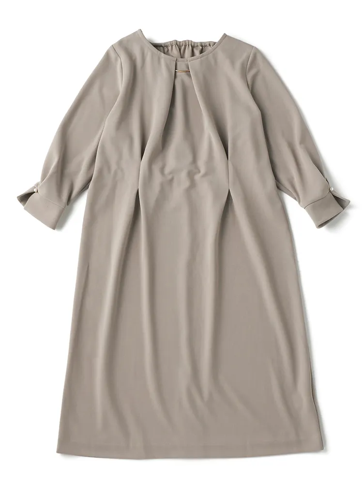 きちんと見えするジャケットと着心地らくちん全方向ストレッチのワンピースの2点SET.ワンピースは後ろゴム仕様で着脱もらくちんで、ウエスト部分のタックデザインが細見えのシルエットを演出します。