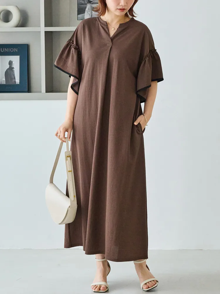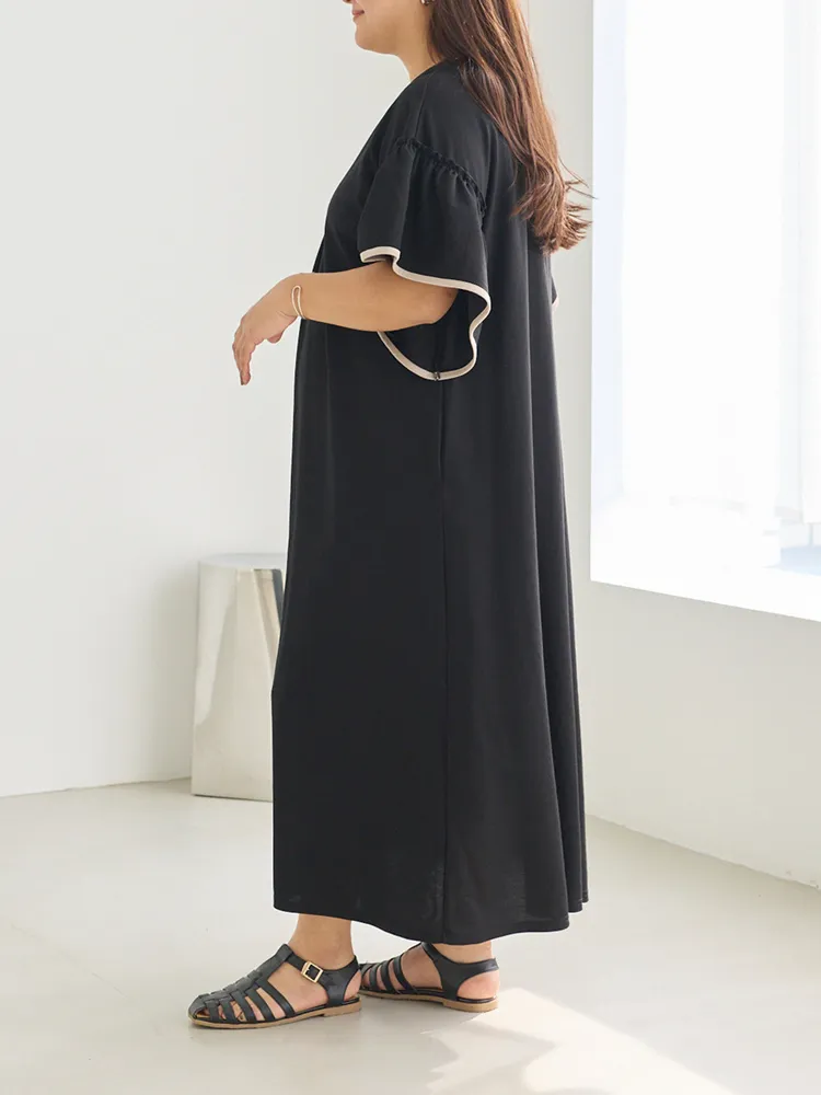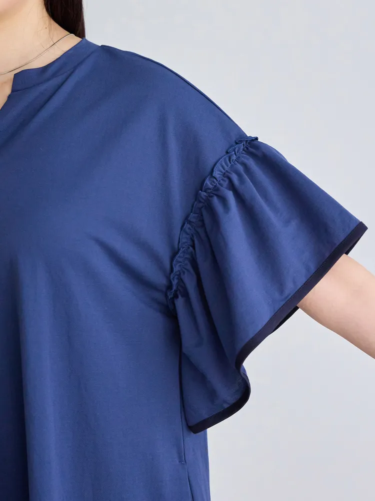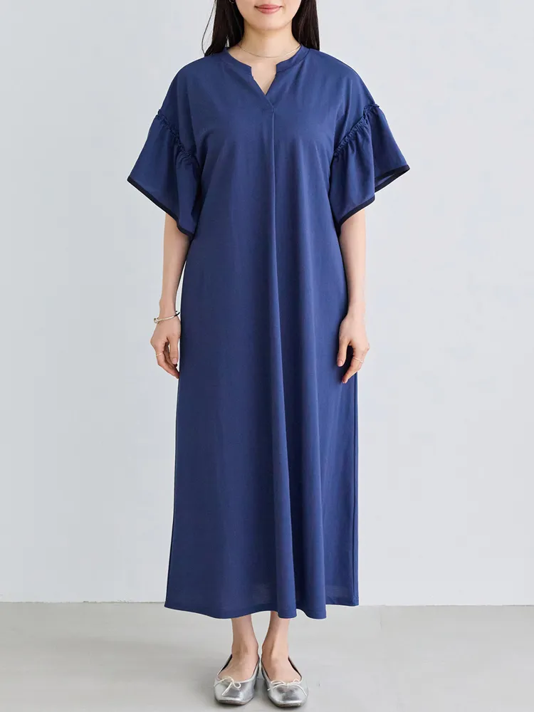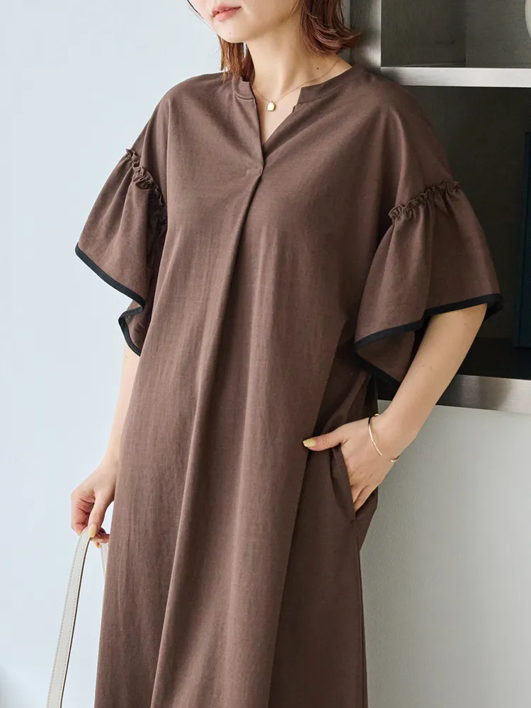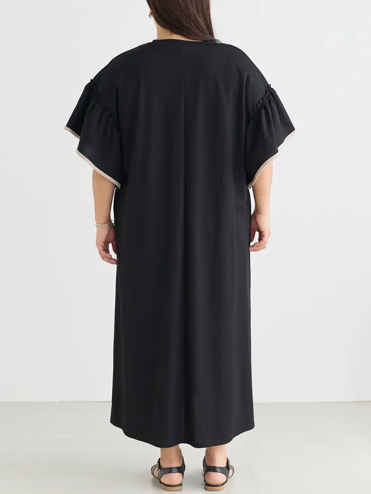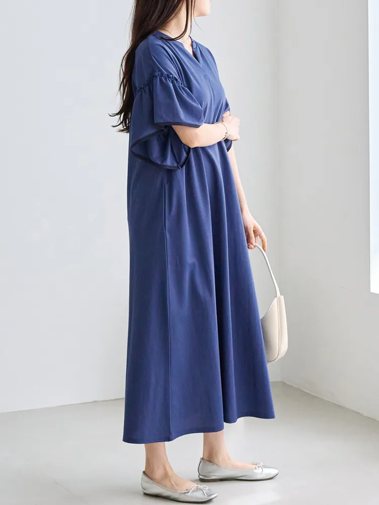 暑い季節も快適に過ごせる、接触冷感機能付きのワンピース。ボディカラーによって異なるバイカラーのフレアスリーブがポイント。ふんわりとしたフレアスリーブが女性らしさを引き立て、気になる二の腕をさりげなくカバーしてくれます。スキッパーネックが顔まわりに程よい抜け感をプラス。身幅はゆったりとしたシルエットで、リラックス感のある快適な着心地も魅力です。