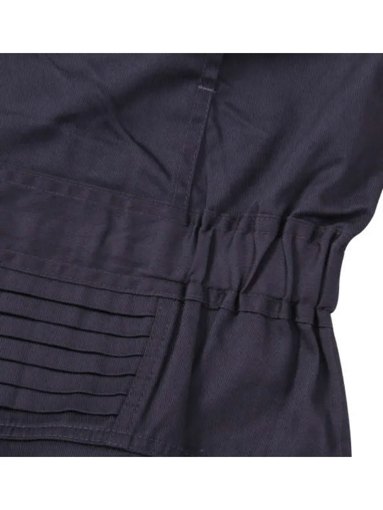 胸フラップポケット(ペン差し・マジックテープ付き)/バック・サイドポケット有/左腕ペン差し有/フロントダブルファスナー/比翼仕立て/スタンドカラー/ラバーワッペン/オールインワン/クライミングカット/袖口(マジックテープ付き)/ウエストゴムシャーリング