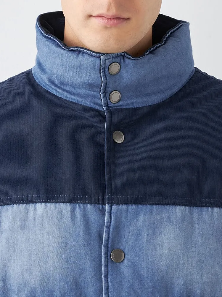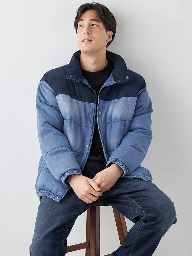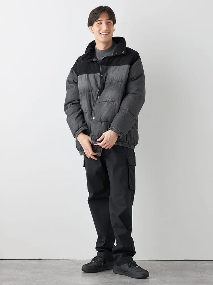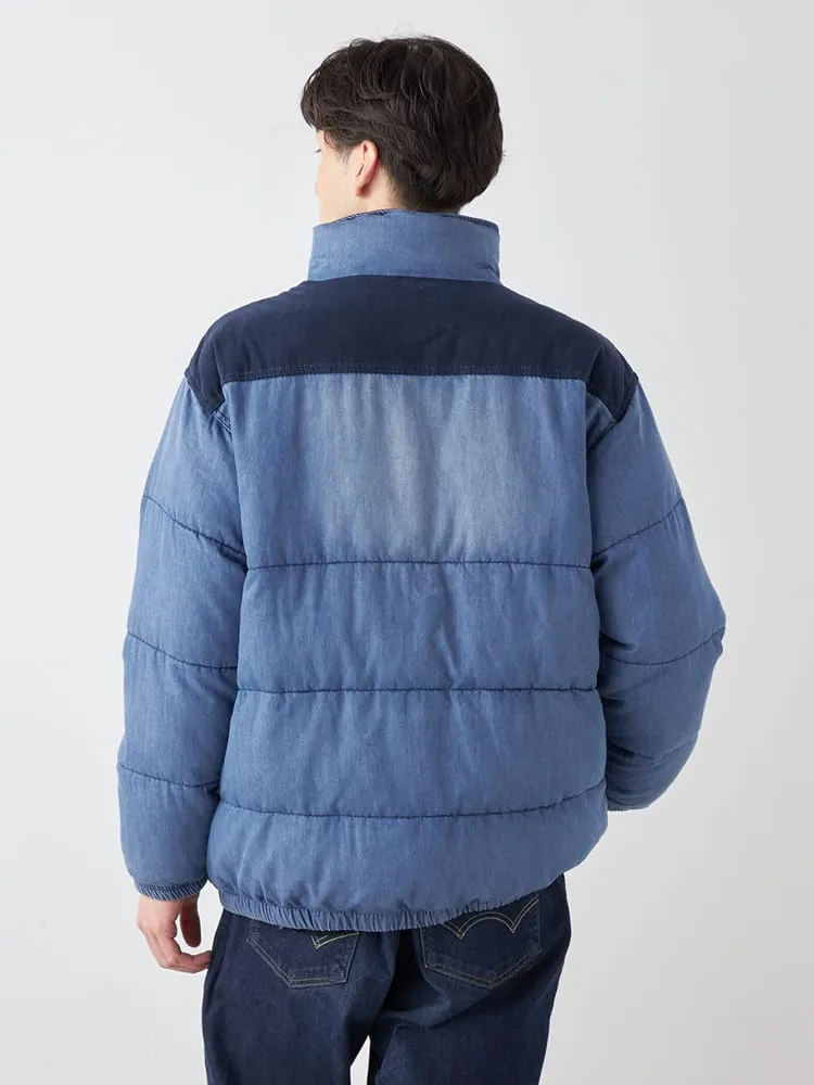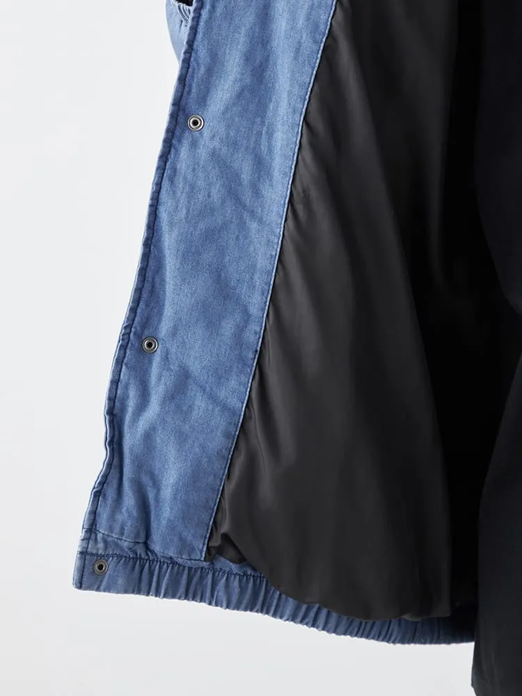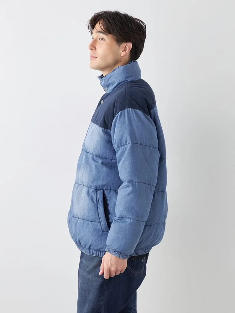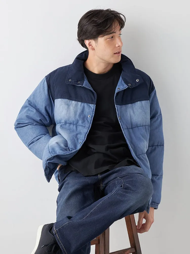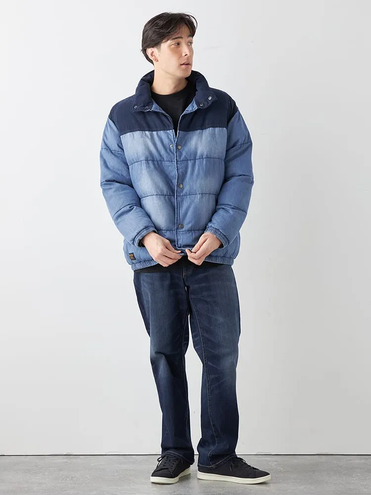 中わた入りで保温性に優れたキルトブルゾンです。ウォッシュドデニムとコーデュロイの異素材コンビネーションにより、上級者風のカジュアルスタイルが完成します。