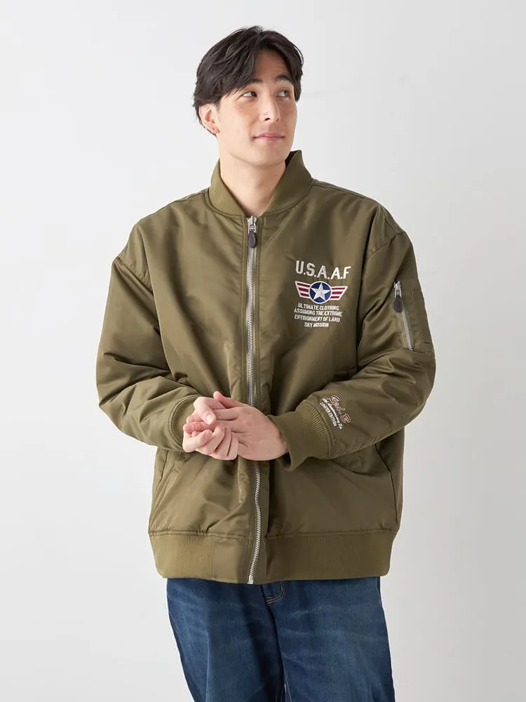 大きいサイズのメンズ 高密度ナイロンツイル MA-1フライトジャケットAVIATIONです。REDBERETSのブランド10周年記念モデル。高密度300Tツイルの表地に保温性中綿、アルミファスナー、大きなミリタリーワード刺繍仕様といったこだわりのディテール内容。クラッシックなビンテージスタイルMA-1を彷彿させる限定アイテムです。