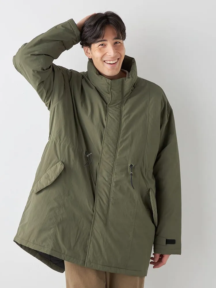 大きいサイズのメンズ ナイロンワッシャーM90中綿ミリタリーコートです。生地表面に独特のシワ感を持たせたトレンドのワッシャーナイロンを使用したミリタリーコート。M90スタイルのミリタリーデザインを今っぽい生地感で洗練された雰囲気に仕立てました。男っぽいディテールながら軽量で着やすいオススメコートです。