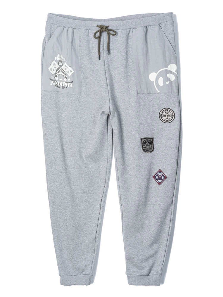配色切替、アイコンプリント、ワッペン刺繍などを組み込んでミリタリーテイストに仕上げた手の込んだデザインスウェットパンツ。