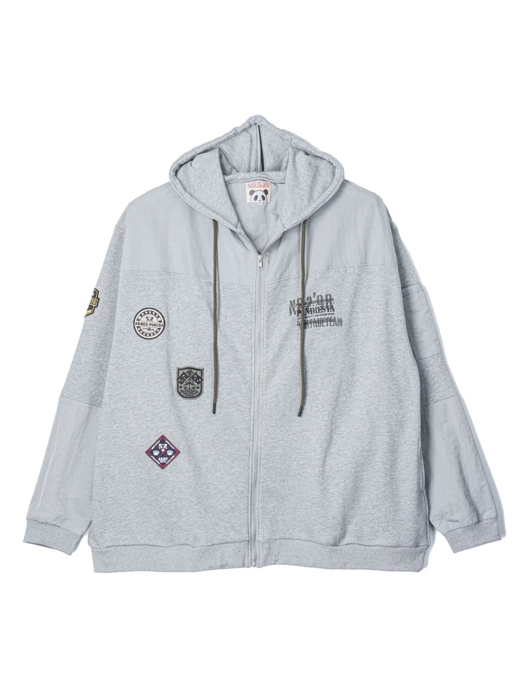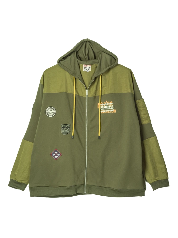 配色切替、アイコンプリント、ワッペン刺繍などを組み込んでミリタリーテイストに仕上げた手の込んだデザインパーカー。