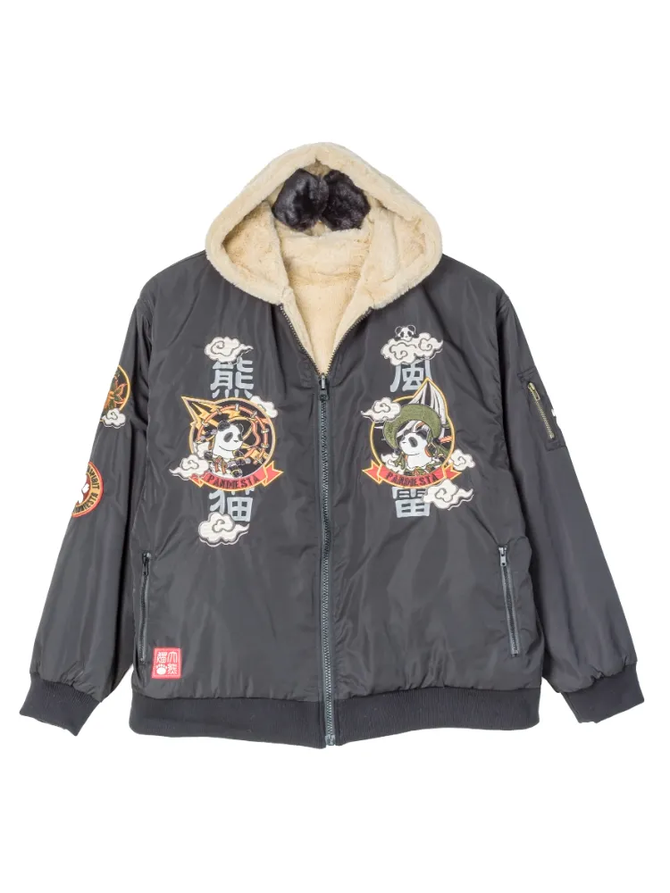 MA-1のアートは人気の風来神パンダを刺繍で表現し、ファーブルゾンパンダアートパッチを貼り付けたはシンプルなデザインでしあげました。