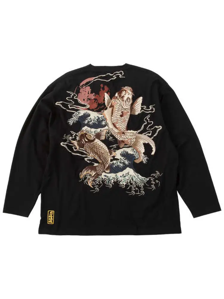 綿100%のブラック生地に、精巧な刺繍で描かれた龍が神々しく映えるデザイン。