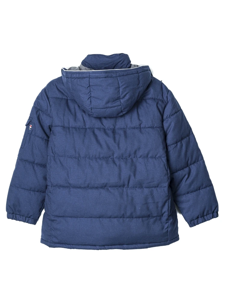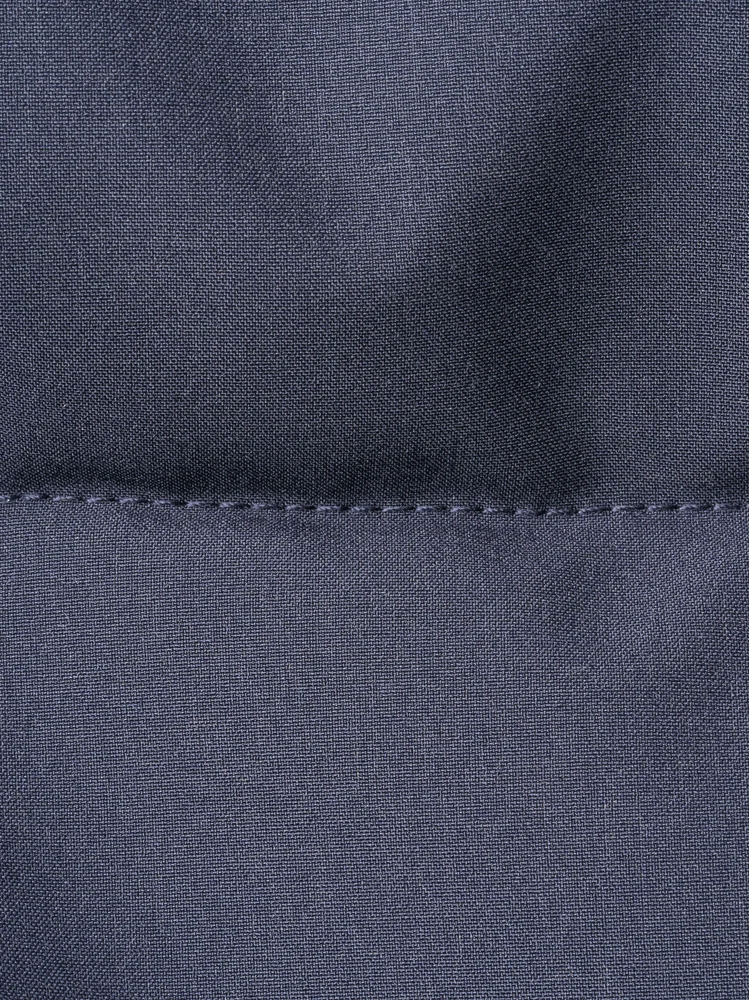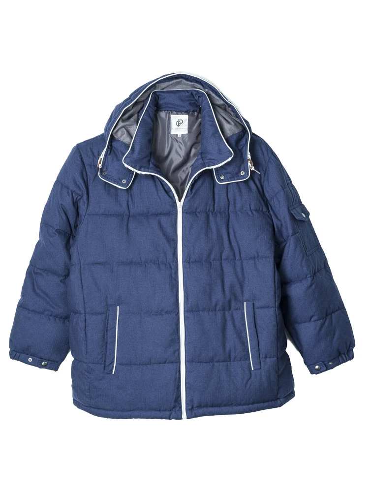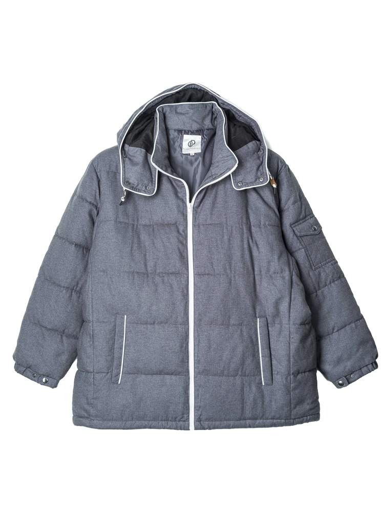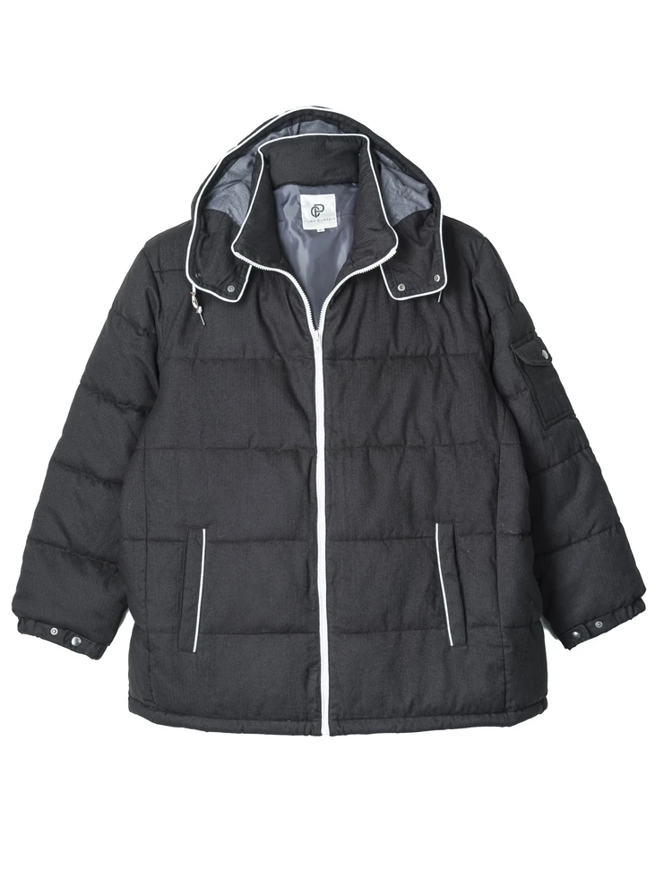 配色のパイピング使いがデザインアクセントとなったフード付きの中綿ジャケットです。