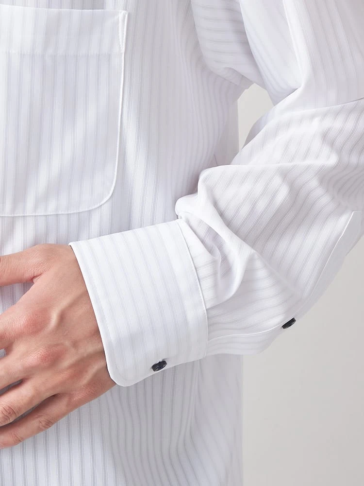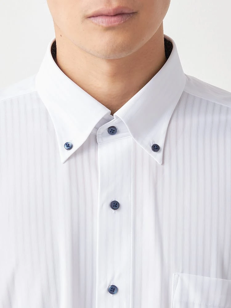 ノータイでも様になり、ボタンを開いても立ち上がりの綺麗な、ボタンダウン襟を採用しています。