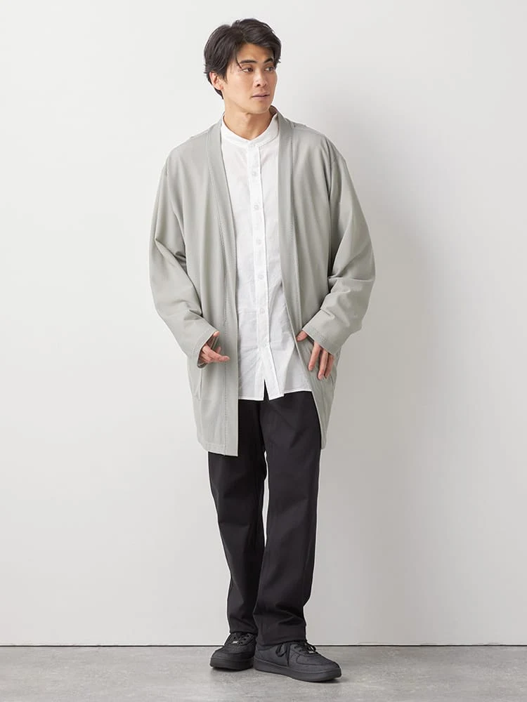 やや長めの裾丈で大人感があり、季節の変わり目にはライトアウターとしての着用も可能です。