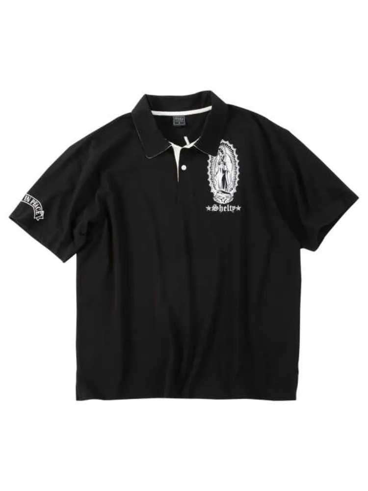 SHELTYの鹿の子刺繍&マリアプリント半袖ポロシャツです。