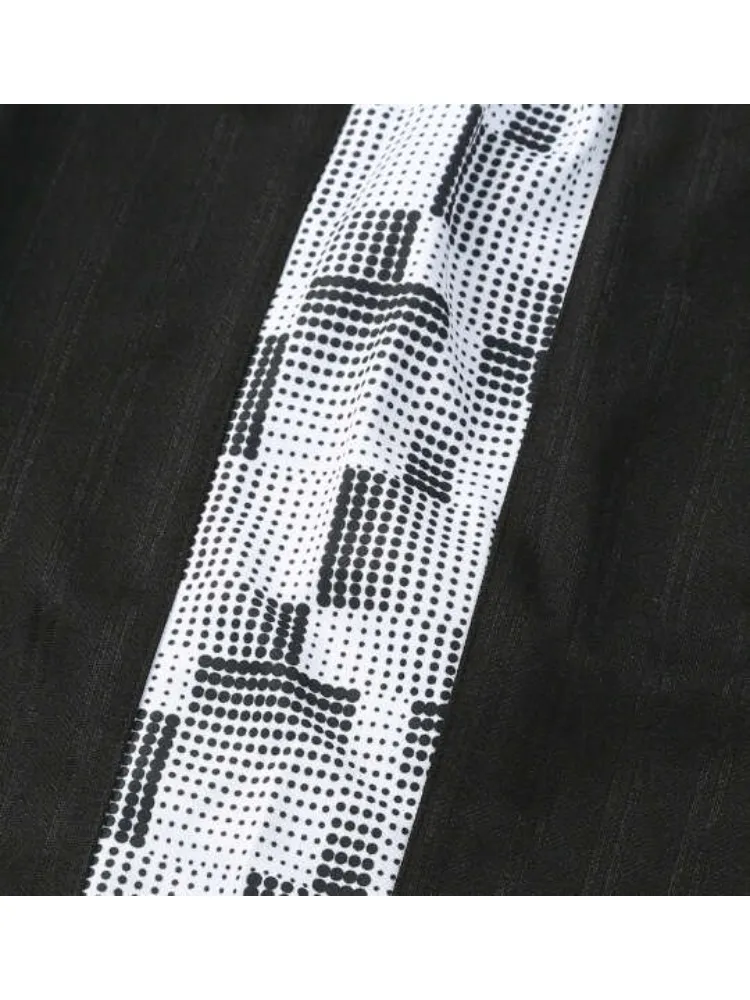 光の当たり方でストライプ柄が浮かび上がるベース生地と、サイドに施したドットプリントが縦ラインを強調。